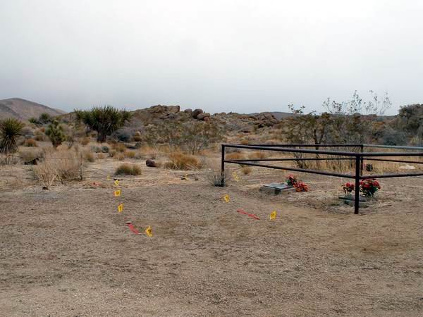 mining camp with few permanent building. The study below was conducted by Stephen Jeppson - St. George using a el-Tracker (element detector like in the periodic tables of elements) for sensing Carbon and Calcium to detecting where bodies have been buried. The graves inside the fenced in area are two normal sized people. However, just outside are one grave of a short person and one grave of a very tall person. This would match the pictures of Coleman and Garrett and that Coleman was a short person and that Garrett was tall. It is possible that when they fenced in the area and placed the head stones, that they picked the wrong graves. |